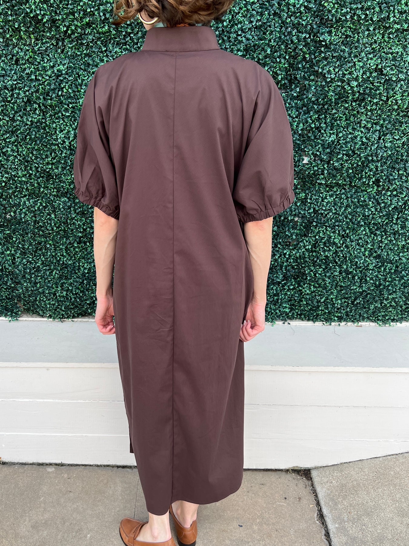 This brown cotton maxi dress features a flattering V-neck and breezy short sleeves, perfect for effortless style. With handy pockets and side slits, it keeps things comfy and fun all day long. Pair it with a cute square scarf around your neck to add a playful touch and complete your look with flair!