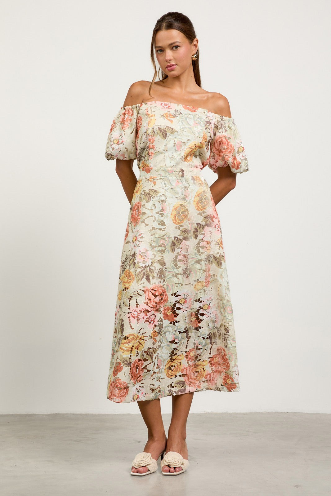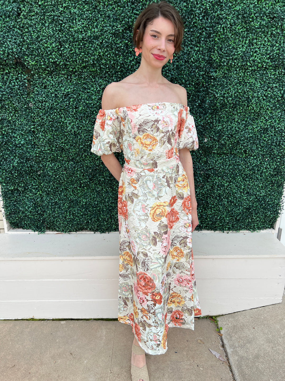 SKIES ARE BLUE | PRINTED CROCHET LACE OFF SHOULDER MIDI DRESS | LINED TO THE KNEE | ZIPPER AT BACK MODEL IS: HEIGHT: 5'8 1/2 BUST: 32" WAIST: 24" HIP: 34 | MODEL IS WEARING SIZE SMALL