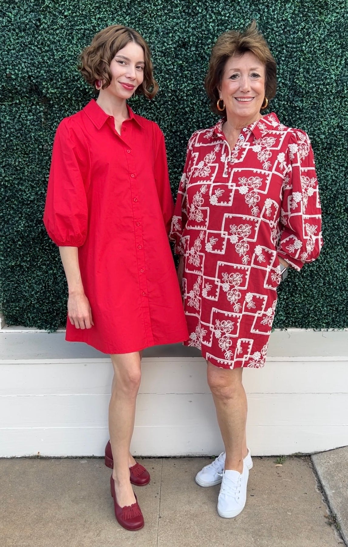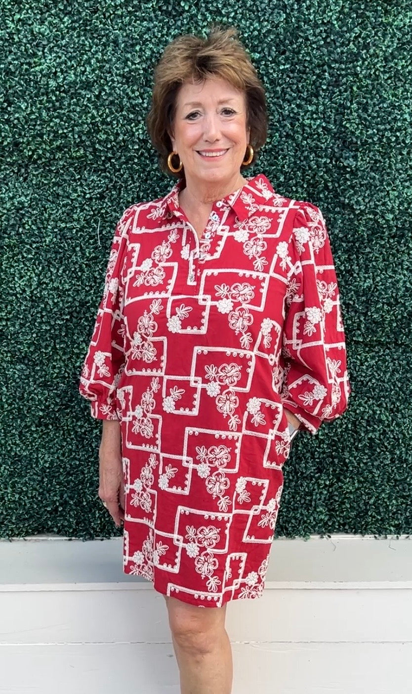 3/4 puff sleeves embroidered dress with side pockets, front button down, collared neckline.- Model is 5'10'' and is wearing a Small.