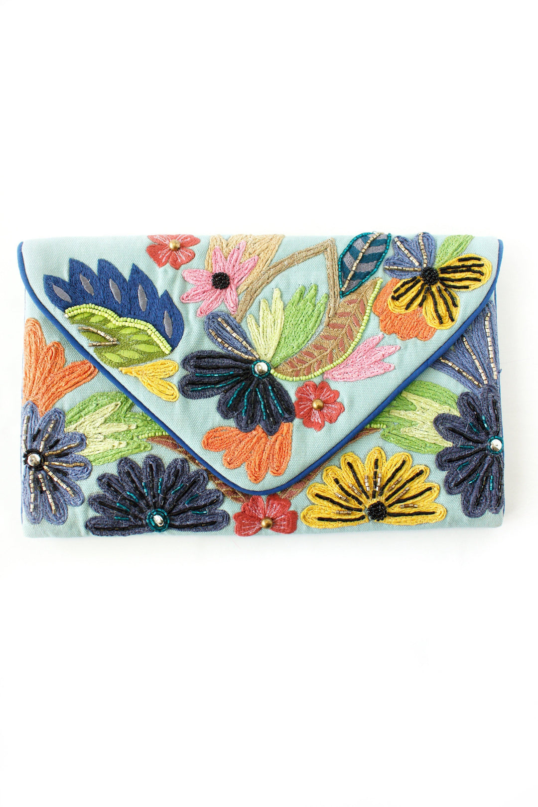 Floral clutch with a mixture of floral and spring sequins and bead embellishments on a light blue/denim background.