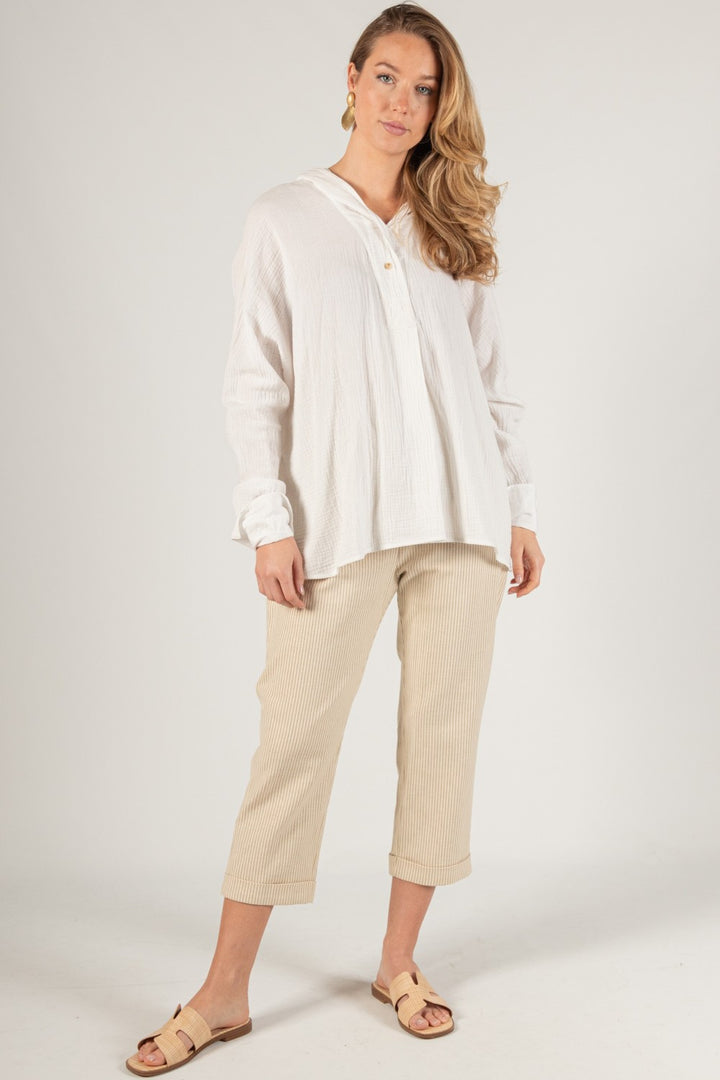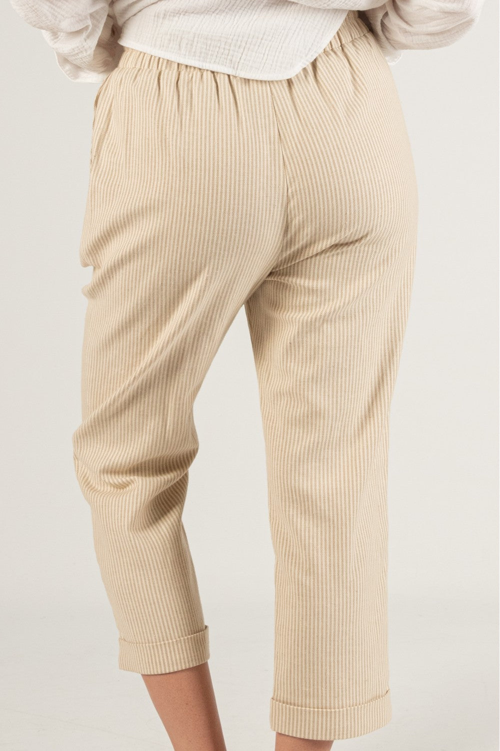 | A Before You Bestseller! Details: - Cotton linen blend twill pinstripe fabrication - Drawstrings and elastic waist band - Tapered legs - Ankle length - Cuffed hem - Relaxed fit |