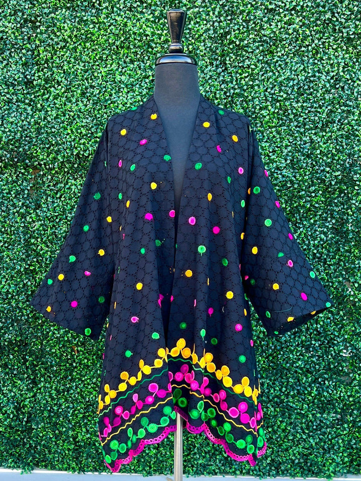 This Embroidered Eyelet Jacket design is the perfect layering piece for Spring and Summer! This lightweight cotton jacket also has pockets beautifully tailored into the seam! The green, pink, and yellow, embroidered dots are so playful!