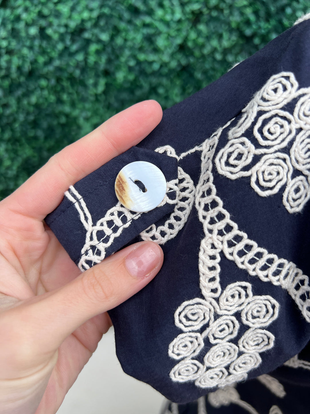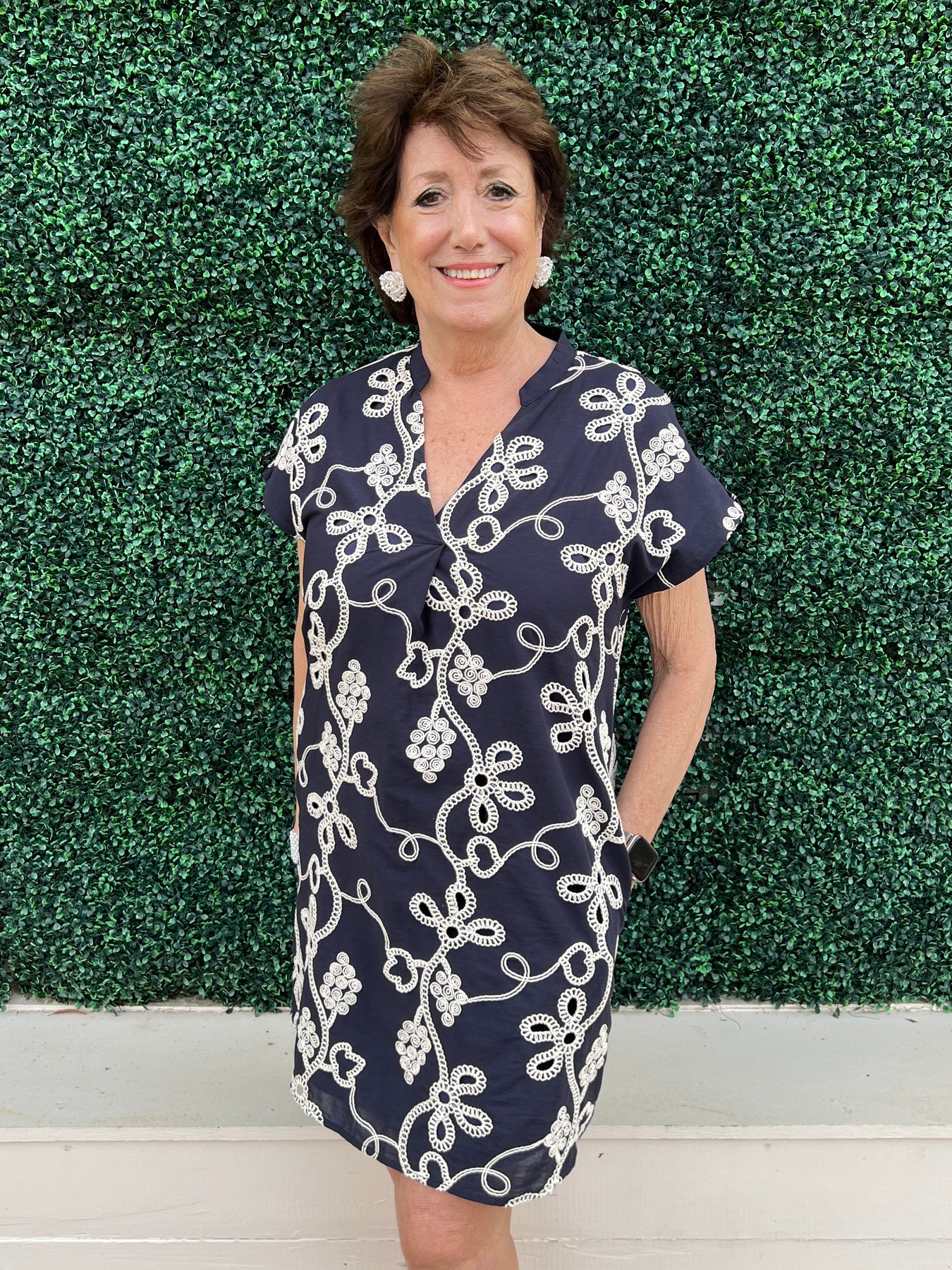 Features pockets and button cap sleeve