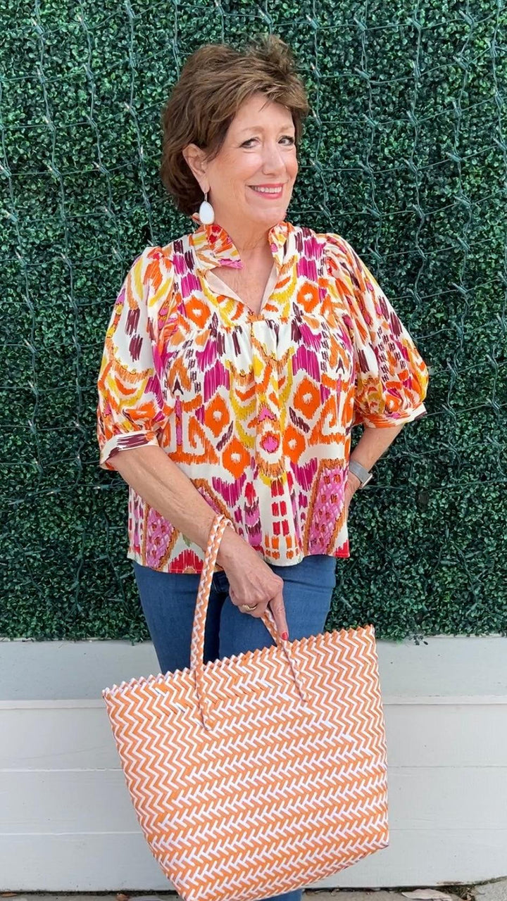Set your style ablaze this season with the Aztec Heat Top! Our Jade Brand has perfectly complemented this fall print with a weight that will keep you cool. Plus, the flattering puff sleeve style is a modern nod to the classic Never A Wallflower top—smokin' hot!