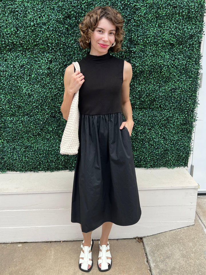 Transform your wardrobe with our Hybrid Midi Dress from She and Sky! A perfect transition piece, this trendy and chic dress features a sleeveless mock neck rib knit top attached to a woven midi skirt with pockets. Stay stylish and comfortable all day with this must-have addition to your closet!