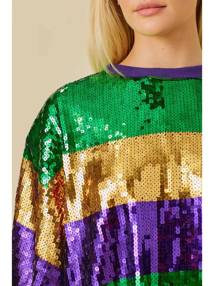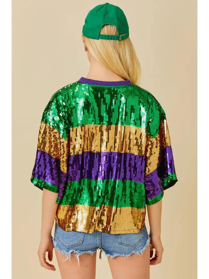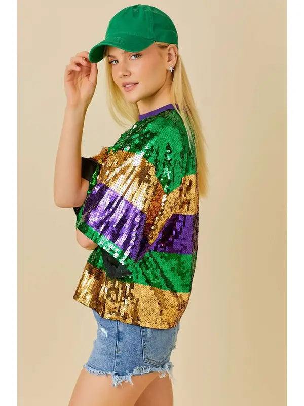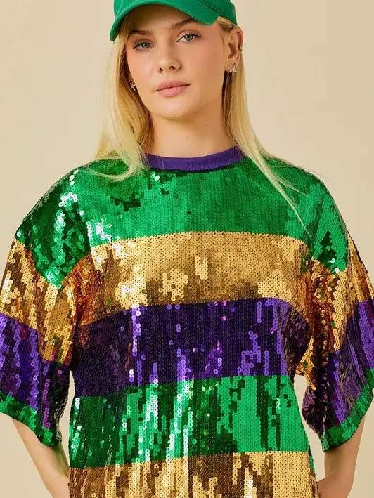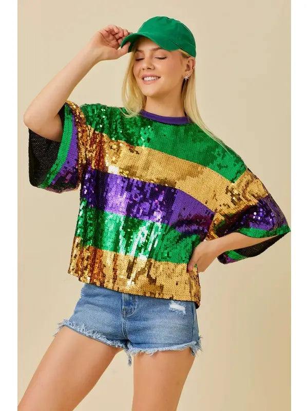 Add some sparkle to your Mardi Gras celebrations with this unique Striped Sequin Tee! Featuring stripes of gold, purple, and green sequins, this boxy top can be dressed up or down for the perfect festive look. Party in style with this fun and playful shirt!