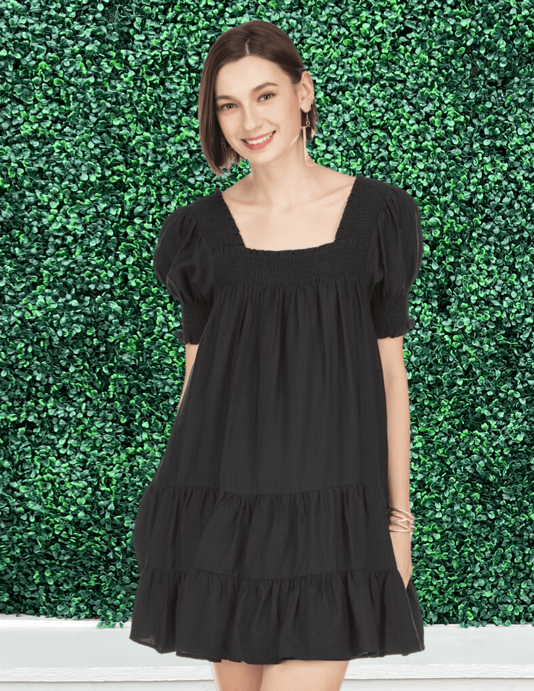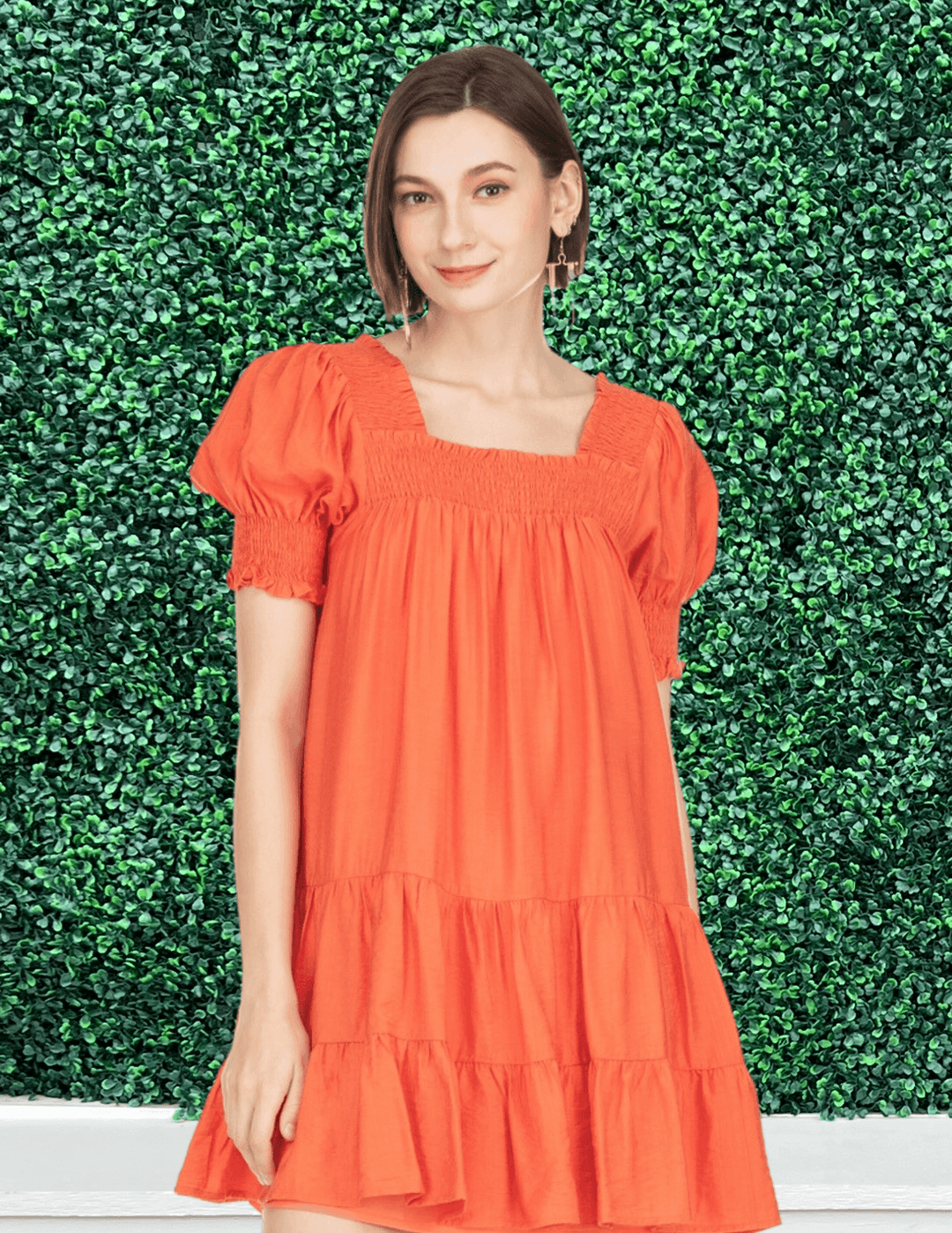 Our Smocked Square Neck Dress from Joy Joy clothing is a tier above the rest! With smocked detail and an elastic puff sleeve, this dress is perfect for a little black dress or some pumpkin patch orange. Look chic and stylish no matter where your day takes you!