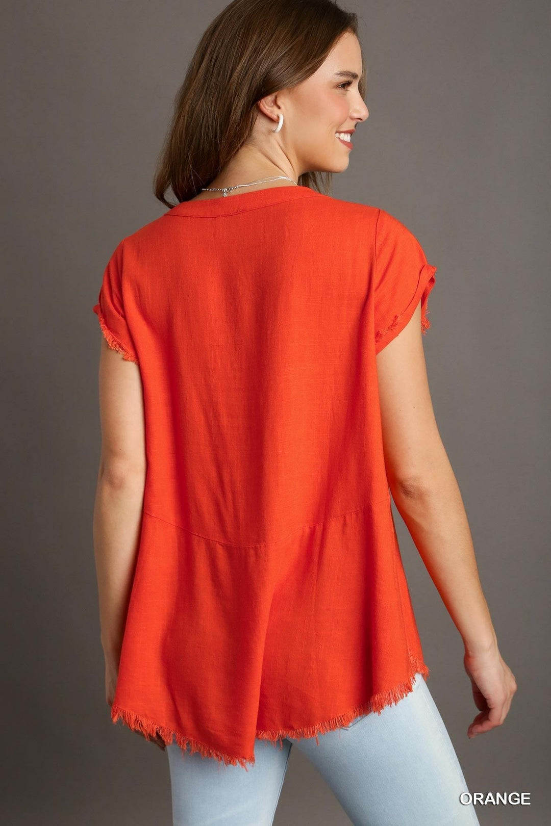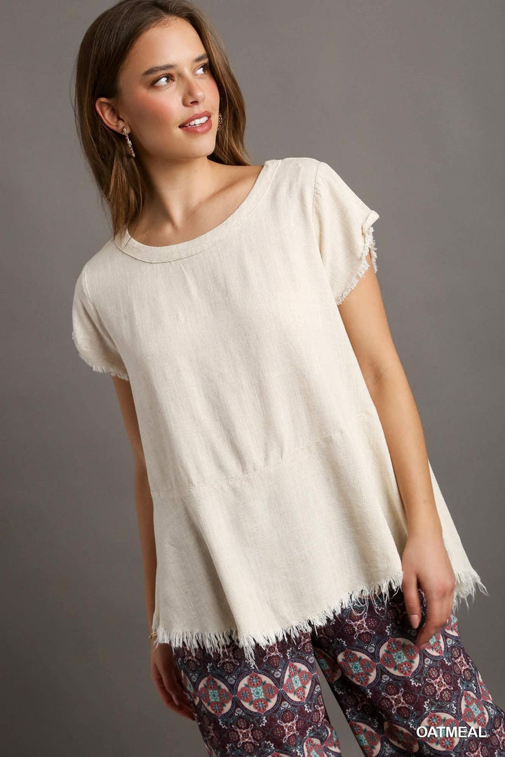 Linen Blend Round Neck Short Sleeve Top with Frayed Hem Details