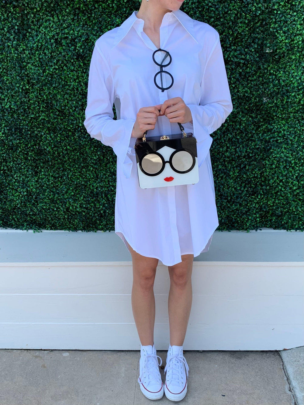 This crisp white top is long enough to double as a dress if you size up! It has flattering pleats down the back and at the wrists.